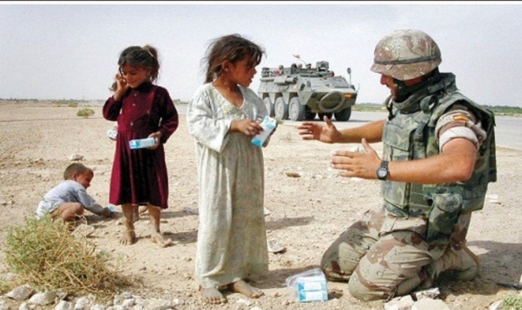 No tenemos muchas cosas divertidas que hacer. Ponemos barcos de papel en un gran charco que hay en la carretera y vemos como los mueven las olas que provocan los coches que pasan. Siempre que jugamos en la calle viene algún niño y nos manda callar, o que dejemos de hacer lo que estamos haciendo. De reír. Nos gusta jugar con los soldados. Los que hay ahora son un poco más pequeños que los que había antes. Más morenos. Son más como nosotros. Por eso nos dejan jugar con ellos. Nos traen caramelos, piruletas, bollos de chocolate, zumos y bolsas llenas de golosinas con colores como nunca hemos visto. También nos sonríen, nos miran a los ojos y juegan con nosotros. Nos dejan ponernos sus cascos y nos suben en el techo de sus coches o incluso a hombros. Siempre están rodeados de niños, cuando aparecen por el pueblo todos corremos detrás de ellos. No les molesta. Vienen de un país que se llama España.