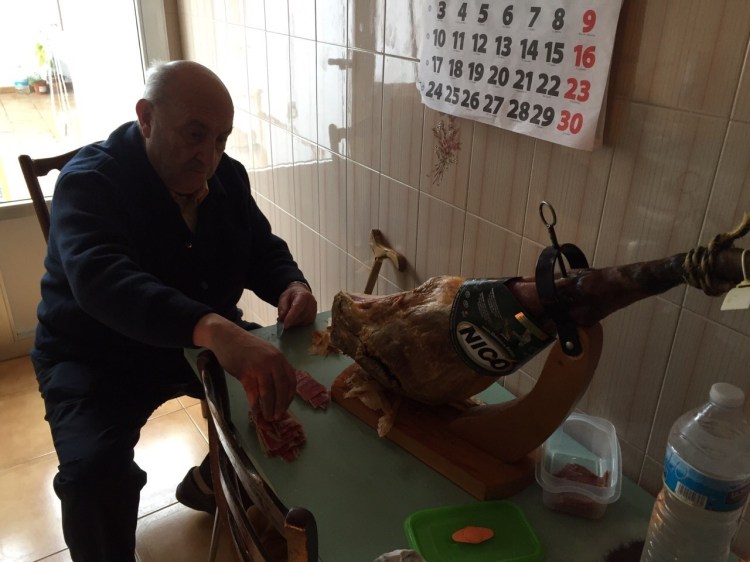 Poco más. Os dejo unas fotos para que le pongáis cara los que no lo conocierais. En la foto da muestras de su talento violinista pero al estilo manchego, no nos vamos a poner puristas con el solfeo a estas alturas. Parte de ese arte implicaba comprar los jamones más baratos del centro comercial, casi a precio de carne sólo porque estaban blandos. Si los dejas curar en las galerías de casa y tienes siempre preparados, cuando te comes el tercero ya tiene la curación que debe. Vamos, que compras uno crudo, lo cuelgas el primero y coges el tercero ya curado. Pagas uno crudo y comes uno curado. Ese proceso en ingeniería química se llama proceso semicontinuo. Me descubro.
